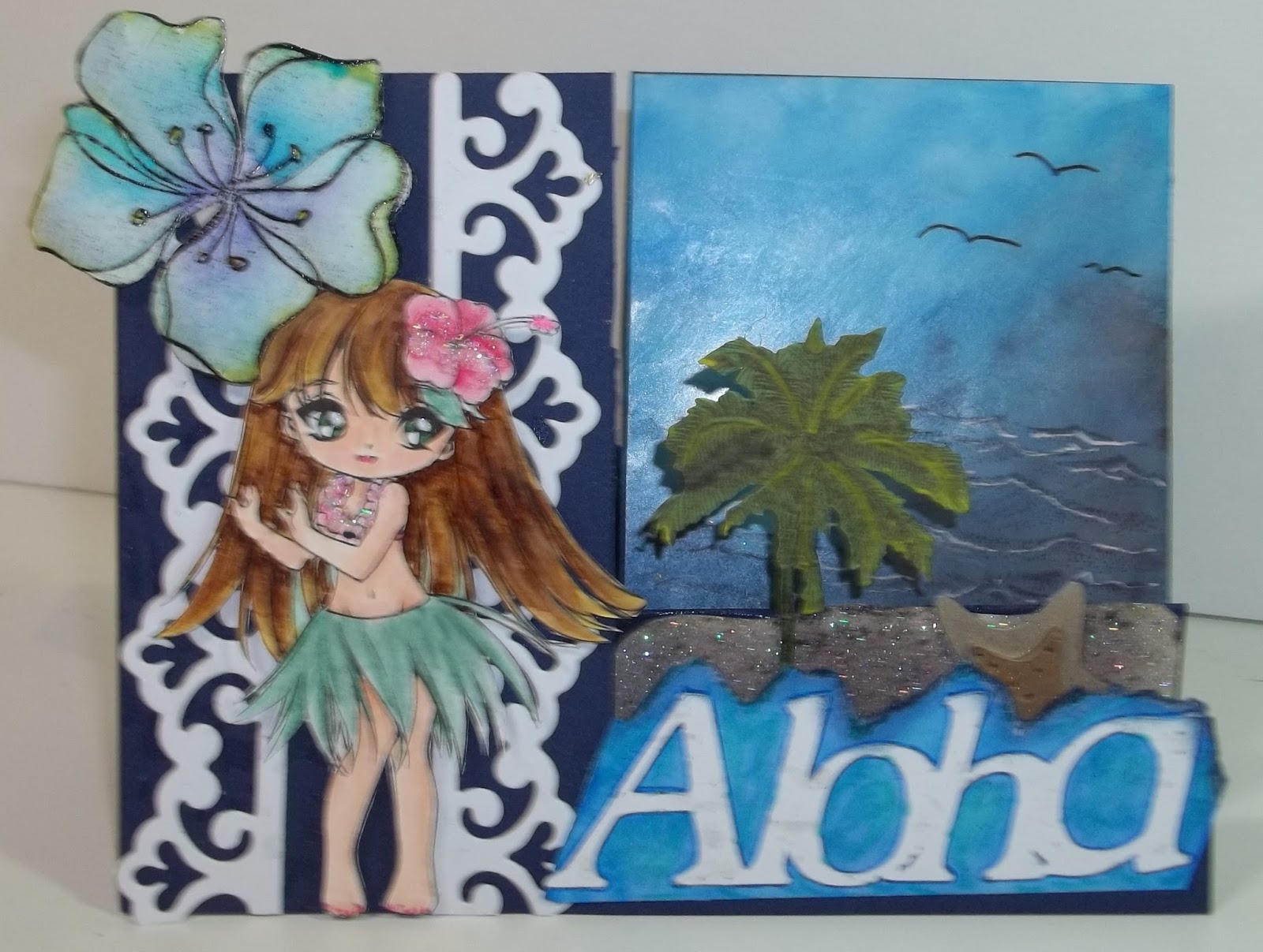Not wanting to be wasteful when I found a watercolor flower I had done, I cut it out and decided it needed to go on a card. I rummaged through my box of bits and pieces and ended up with the following "Aloha" card.