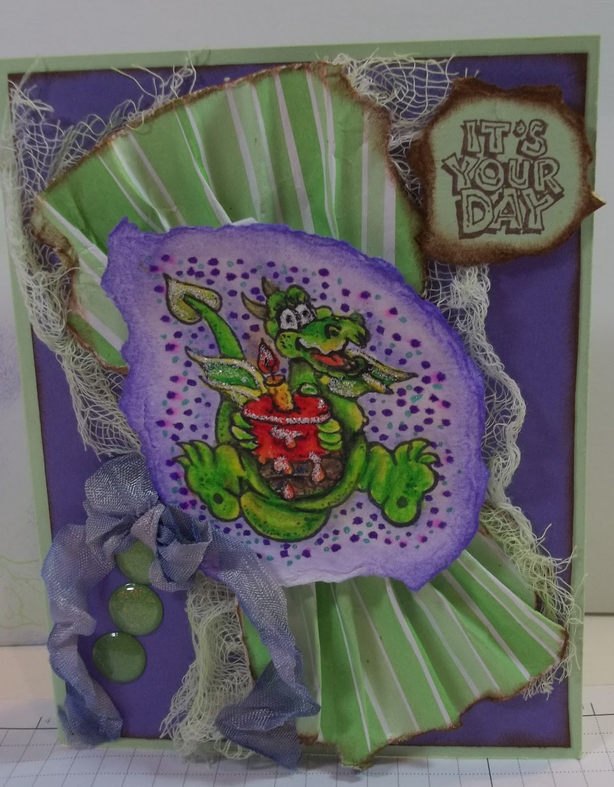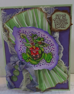 Yesterday I was going through some of my old stamp sets and came across the "Darling Dragons" set from Stampin' Up. I've been really enjoying the things different artists are doing with Tim Holtz' Crazy Birds lately, and thought these dragons might be cute done in bright, funky colors. This is the card I made from one of the dragons, not my best, but it was fun to do, and it gave me an opportunity to play with my new Inktense Pencils.