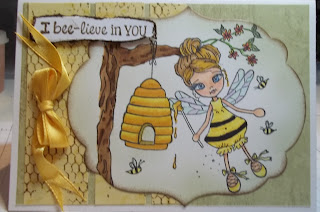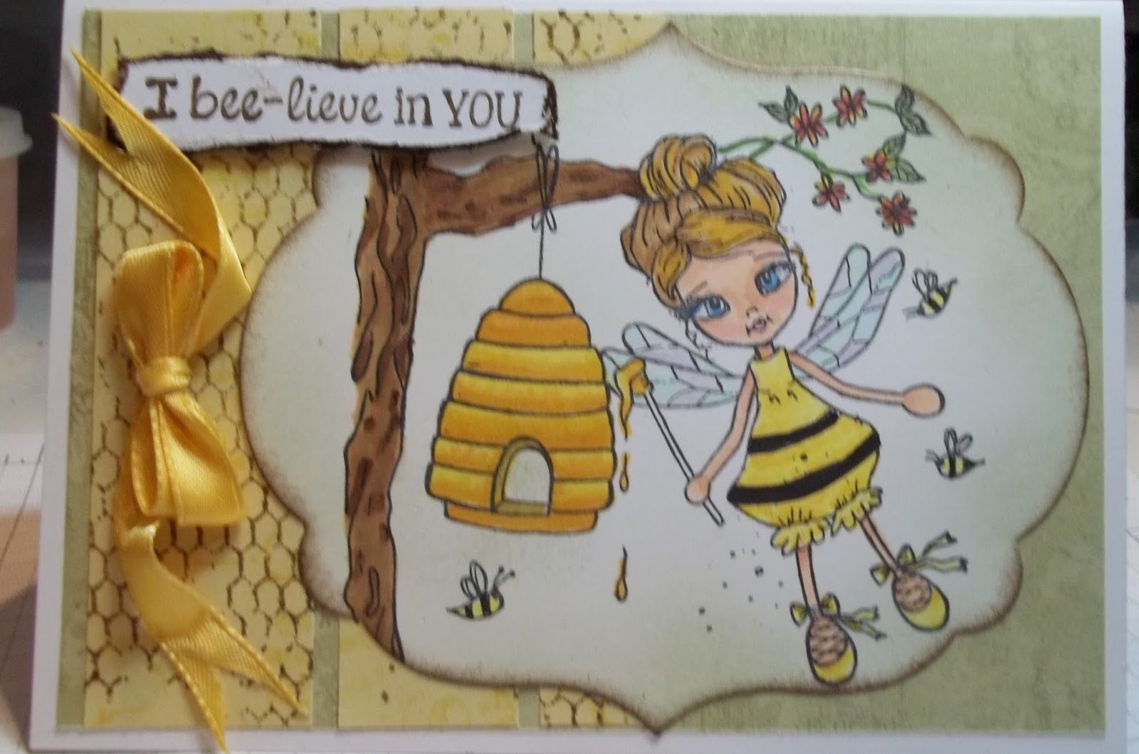 This card was made for one of my granddaughters. I used Unity Stamp Company's "Beth the bumblebee Fairy" stamp as well as their chicken wire background stamp (I think it looks like a beehive). The image was colored with Copic markers and I used Stampin' Ups label framelit to cut out and frame the image. The frame was sponged with Tim Holtz Ranger Distress Ink Vintage Photo, and the card was finished off with a satin bow.
